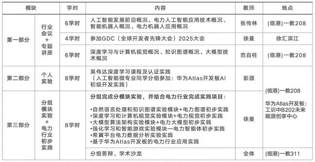 全体同学参加了由上海市人工智能行业协会主办的“2025GDC全球开发者先锋大会”,并听取校内人工智能领域两位专家教授的前沿讲座,开阔了视野,为后续综合实践奠定了理论与行业发展及应用背景知识基础。英伟达深度学习认证课作为深度学习的入门课,以理论加实训实操的形式为员工打开了人工智能实践的大门。实验部分贯彻团队合作学习、个性化学习的理念,以分组分模块的形式开展,其内容包括课程组与希冀平台共研的四个模块自动测评实验,以及与华为公司共建的Atlas200DK开发板实验。在综合实践部分,为激发员工创新意识,进一步培养员工团队协作与工匠精神,引导员工深入探究人工智能技术与能源电力实际场景的结合,在分组分模块实验的基础上,初步设计开发能源电力行业应用实践。同时,多名人工智能方向的研究生助教全程参与实验实践指导。在课程结束时,由班委组织课程展示交流沙龙活动,答辩成绩由各员工团队和教师团队共同打分进行综合评价。