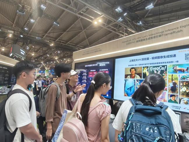 最后,师生们来到世博展览馆的互动体验区,近距离接触前沿技术产品。现场,上海交大EPIC实验室的视频图像生成加速技术等成果以及电力配网光通信等相关展示,呈现出数智化在不同领域改变人们生活和工作方式的多样场景。同学们参与各类互动项目,对科技赋能各行业有了更深入的理解,切实体验到前沿科技的魅力。
