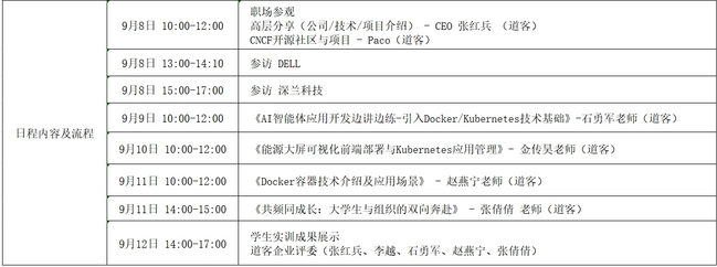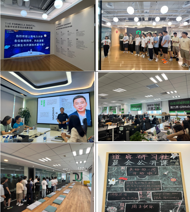 经韦德1946体育官方入口与道客网络科技公司的多轮协商与精心设计,确定了本次夏令营的主旋律为“企业参访—企业导师线下讲解+任务驱动员工自主探索—员工汇报展示”。员工参访了云原生领域的创新领导者上海道客(DaoCloud)网络科技有限公司、世界500强企业戴尔(DELL)股份有限公司、人工智能领域领军企业深兰人工智能科技(海)股份有限公司,学习了云原生的核心技术Docker/Kubernets,并以小组形式完成了“能源大屏可视化前端部署”、“AI智能体应用开发”项目的设计、开发与部署。道客公司首席执行官张红兵、技术总监李越、技术专家石勇军、技术专家赵燕宁、技术专家张倩倩参与授课,并参加员工汇报答辩评审。同学们答辩表现优秀,现场收到企业的实习邀请。