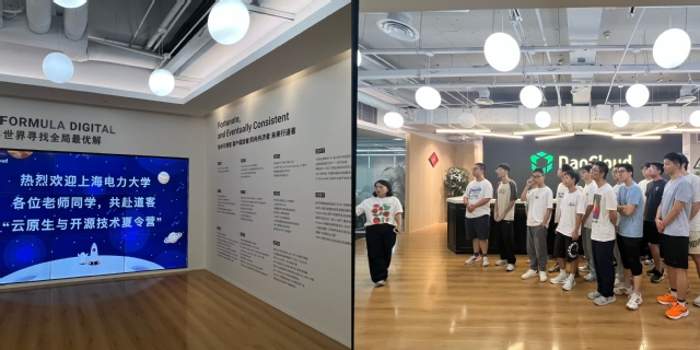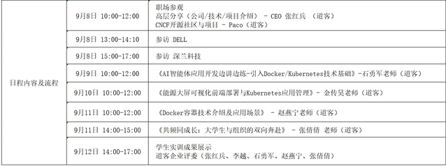经韦德1946体育官方入口与道客网络科技公司的多轮协商与精心设计,确定了本次夏令营的主旋律为“企业参访—企业导师线下讲解+任务驱动员工自主探索—员工汇报展示”。员工参访了云原生领域的创新领导者上海道客(DaoCloud)网络科技有限公司、世界500强企业戴尔(DELL)股份有限公司、人工智能领域领军企业深兰人工智能科技(上海)股份有限公司,学习了云原生的核心技术Docker/Kubernets,并以小组形式完成了“能源大屏可视化前端部署”、“AI智能体应用开发”项目的设计、开发与部署。道客公司首席执行官张红兵、开源总负责人徐俊杰Paco、技术总监李越、技术专家石勇军、技术专家金传昊、技术专家赵燕宁、人力资源总监张倩倩参与分享与授课,并参加员工汇报答辩评审。同学们答辩表现优秀,现场收到企业的实习邀请。