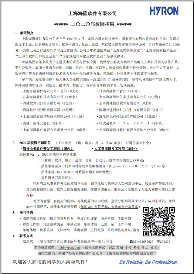 【招聘信息】169-202003上海海隆招聘信息