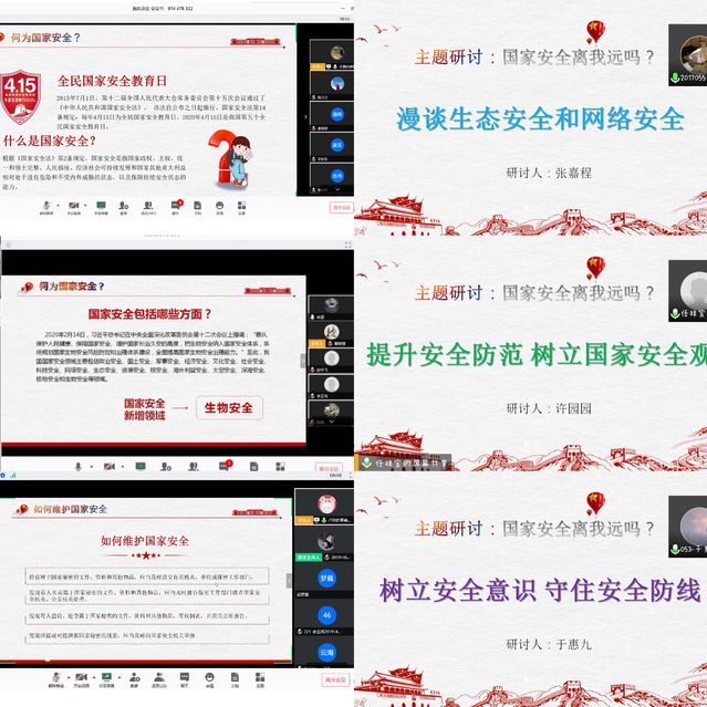 活动中,员工还采用知识问答、讨论交流等多种形式开展在线主题研讨。不少员工就2020年国家安全新增领域“生物安全”和疫情之下的“网络安全”进行了漫谈;对如何树立安全意识,提升安全防范和守住安全防线进行了探讨。在主题研讨中,本科生提到,“我们要敢于负责、勇于担当,对于网络上的信息要有自己的判断力”;要“坚持贯彻落实国家安全观,将爱国主义作为核心,将国家安全作为根本,巩固社会基础,增强社会责任感,走中国特色社会主义国家安全道路”。研究生也谈到,“我们应该坚持新国家安全观,坚定理想信念,切实维护国家利益,维护国家安全,保守国家秘密”;“既要有‘乱云飞渡仍从容’的战略定力,也要有‘不到长城非好汉’的进取精神”,“通过各种方式为维护国家安全贡献智慧和力量”。