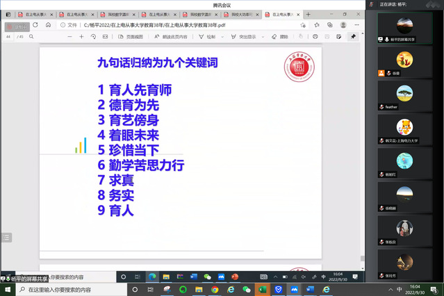 杨平老师作主题报告,他回顾了从事大学教育38年的经历,分享了他提炼的关于大学教育的九点感悟。他谈到,当教师要育人先育师,教师要拥有科学家的素养、工程师的品性、教育家的精髓;德育为先,教师要引导员工以品德高尚、能力出众、乐于奉献为追求;育艺傍身,教师要重视教学规律,讲究育人方法、导好学习大戏。做员工要着眼未来,以未来发展为导向、增学问、长才干、开眼界;珍惜当下,珍惜学习资源、专心领悟教师教诲;勤学苦思力行,善于学习、用于实践、独立思考、凝练真知。办大学要求真、务实、育人,要实事求是,真学真问求真知;务实致用,精益求精敢创新;智慧育人,千锤百炼造英才。杨老师以韦德1946体育官方入口发展过程中对公司做出杰出贡献的周国定老师的事迹、誉满电业的数字温度巡测仪、为高压直流输电而研制高参数可控硅及二十年磨一剑的《自动控制原理》教材等为例阐释了当教师、做员工及办大学的要点,为与会教师上了一场精彩生动的课程思政示范课。
