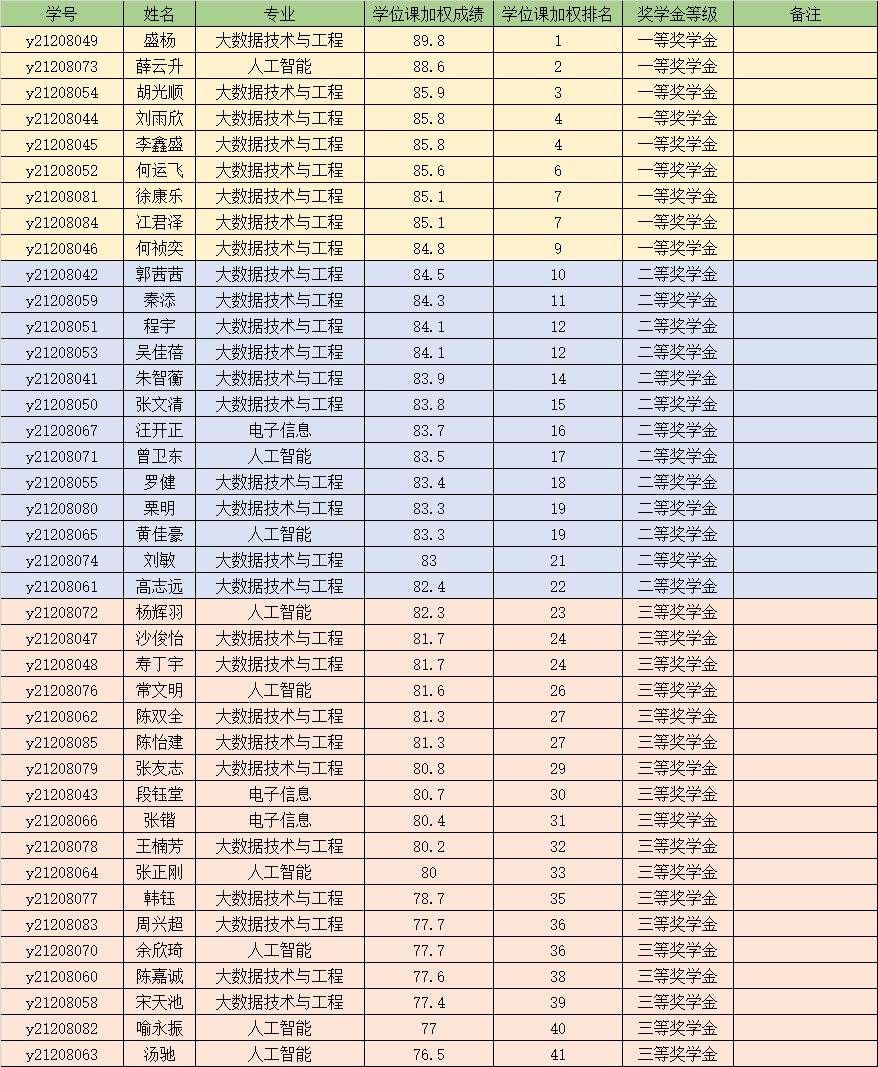 2、计算机技术专业一等分配名额为8,因最后一位与下一位同分,故一等为9人;二等分配名额为12,因一等多1人,应为11人,但最后一位仍与下一位为同分,故二等仍为12人。三等奖分配名额为16,一等二等总人数多1人,故三等为15人。