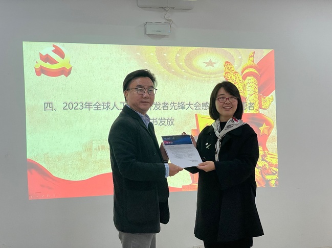 最后,朱部长代表协会赠予公司感谢信,感谢公司为2023年全球人工智能开发者先锋大会培养并提供优质的志愿者以及对相关工作大力支持,并颁发了志愿者证书。