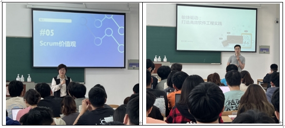 在课程实践启动之前,外企技术专家张伟和杨立斌于6月8日给计算机专业三年级员工作《敏捷实践之Scrum的故事》、《敏捷驱动:打造高效软件工程实践》技术讲座,以讲故事的方式讲解为什么要使用敏捷开发以及如何落地敏捷开发,让员工们感受在企业中软件是如何一步步构建起来。6月9日,企业提供相关技术资源提前发布给员工供自主学习,同时完成课程实践开发基础环境的搭建和配置。