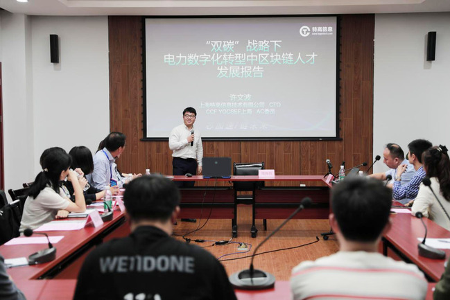 许文波以《“双碳”战略下电力数字化转型中区块链人才发展报告》为题做报告,说明了区块链技术的重要性,结合在工作中的经验谈到了“双碳”战略下电力数字化转型中区块链研究的方向、目标和人才结构以及区块链技术目前人才供给不足的问题,倡导加强人才培养和平台建设。