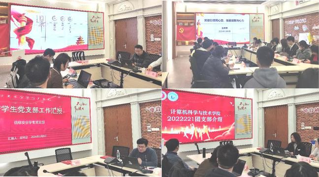 信息安全教工党支部书记王勇、信息安全员工党支部书记任祥宝、大数据员工党支部书记孙倩倩分别围绕“一支部一品牌”做支部介绍;团支部围绕在思想建设、学风建设等方面等介绍了支部情况。