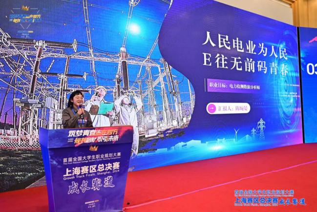 成长赛道分为“主题陈述”、“评委提问”和“喜从天降”三个环节,考察选手职业目标的选择、行动成果的成效以及对目标的契合度等成长要素。陈婉晏以“人民电业为人民,E往无前码青春”为主题,立足于公司能源电力优势,结合数据科学专业特色,讲述了她立志深入家乡贵州遵义最基层,用心、用情、用力成为一名电力检测数据分析师的信念。她从自身家庭成长经历为切口,结合当前国家能源发展需求,详细阐述了她为职业目标作出的技能分析与能力提升,并进一步规划了未来的发展路径,以扎实的专业能力、亲和的态度、谦逊真挚的表达打动评委,凭借优异的综合成绩,斩获成长赛道金奖。