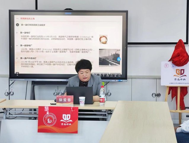 随后,徐爱蓉作《矢志不渝跟党走,笃行不怠逐未来》主题讲座,她从“照亮新生的上海”、“赋能奋进的时代”和“驱动美好的未来”三个方面讲述新时代十年电力的变革,新时代十年是电力行业发展质量最好、突破性进展最多、清洁低碳转型速度最快的十年。重点从第一座发电厂、第一批点点灯用户,一大诞生点亮电力行,第一个电业党支部成立,电力工人英勇护厂,电力工人坚守岗位助力新中国发展等方面讲述电力照亮新生的上海,同时从电力助力中国营商环境、上海电力迈入特高压、进博会5G技术提升智慧保电、电力驱动长三角发展等方面讲述奋进新时代、电力驱动美好未来等内容。