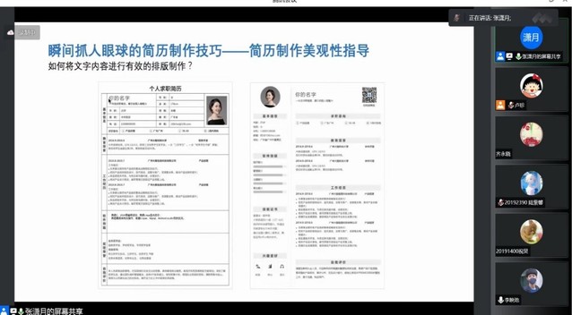 接着,员工李映池通过结合自己个人的简历来指导同学们如何让自己的简历脱颖而出,写简历就要打造个人职业品牌,好的简历内容必须针对应聘岗位,措辞要具体、简洁、有条理,模板建议选择商务的、易于阅读的。随后,张潇月老师进行“瞬间抓人眼球的简历制作技巧”简历设计技巧分享,希望同学们依据职位要求展现个人的技能和自我评价,简历的制作和排版设计在一定程度上也体现了专业能力素养。最后,任祥宝老师从企业角度进行简历指导培训,他讲述如何通过简历提升对岗位的匹配度,在任老师跟同学们分享个人建议后,同学们对考证、职业选择等问题向任老师积极咨询,现场气氛活跃。