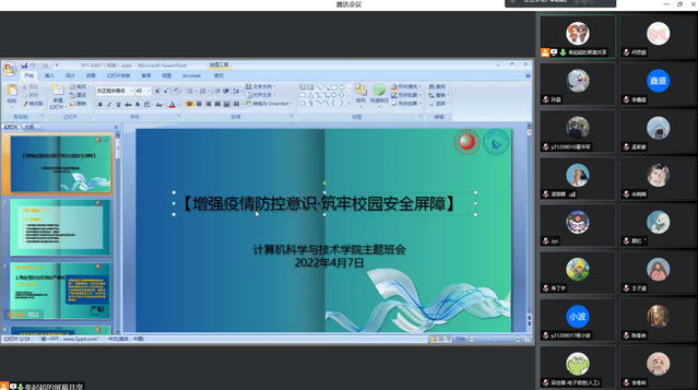 面对三月以来的严峻的疫情形势,加强防疫措施、提升防疫意识刻不容缓。为进一步落实疫情防控工作,引导员工加强防疫意识,遵守校园防控规定,公司本研各班级于2022年4月7日至10 日期间全部完成“增强疫情防控意识·筑牢校园安全屏障”线上主题班会的召开。