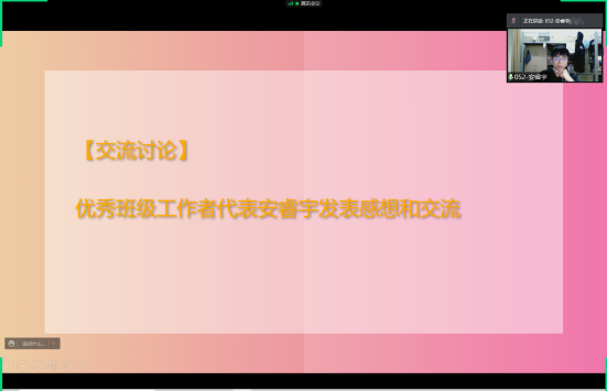 越是艰难困苦的环境,越是要保持积极上进的心态。在班会上,老师们从学习、生活、娱乐等多个方面向同学们展示了公司和公司展开等多项活动,如已经举办的主持人大赛和即将推进的心理健康节等一系列活动,帮助同学维持阳光积极的情绪,鼓励同学参与丰富多彩的活动。为了进一步端正员工的学习态度,老师们向大家介绍了韦德1946体育官方入口2021级21网络工程蒯升磊同学在做核酸排队过程中仍积极参与线上课程,并认真做笔记的事迹。各班级交流了在线教学的学习方法,同时大三班级根据同学有考研的学习情况计划开展考研线上自习室等活动互相学习,互相监督,共同进步。