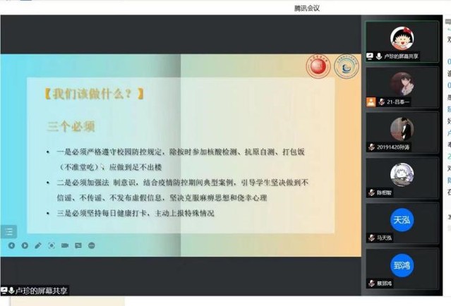 会上,每位老师都用多种方式向同学们阐释当前疫情的严峻与高校防疫的严肃,同学们也深刻认识到抗击疫情的重要性。辅导员任祥宝老师在班会上邀请华山医院医务工作者钱旻骏妈妈,科学讲解了奥密克戎特点,并传授预防疫情传播的5个技巧,引导员工用科学的态度面对疫情,将不良心理影响降到最低;毕业班的辅导员王静老师通过图文数据向毕业班员工分析了当前防控形势,希望员工深刻认识高校在疫情面前不是一方净土,具有“脆弱性”;辅导员奉起超老师、卢珍老师带领同学们学习了习近平总书记关于疫情防控的重要讲话和指示批示精神,用多种案例阐释了“六个讲清楚”;实习辅导员宋钰和兼职辅导员汪海伦老师以动态数据指数型增长向同学们展示了疫情的严重性;辅导员孙倩倩老师以一段护士与居委书记的电话录音导入,以情感人,强调了作为青年老员工,在疫情防控中要承担的责任和担当,同时也为同学们讲清了巩固当前防控成功的重要性,以及最终全面战胜疫情的必然性。