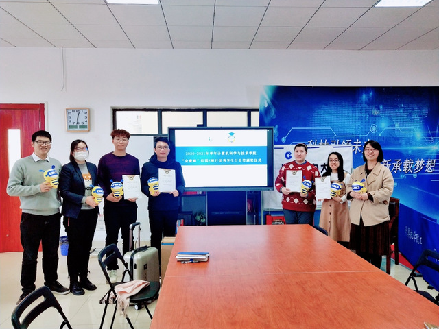 此次表彰仪式以“与榜样同行,谱青春华章”为主题。孙文琦宣读了本次优秀员工行员的评选标准,介绍了孙勇、岳喜超等五位优秀员工行员的事迹表现,感谢了公司公司对校园E银行日常运营的大力支持,肯定了员工行员一年来的辛勤付出。随后,齐永晓和孙文琦共同为五位优秀员工行员颁发了获奖证书,奉起超颁发了奖品。