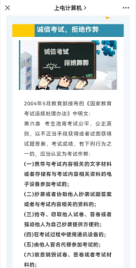 推送考场规则,营造考试氛围。公司发挥微信平台作用,推送主题教育“诚信考试,从我做起”,通过对考场规则和考试违规处理的介绍,加深员工对考试违纪作弊危害的认识,教育员工诚信为本,坚持自立自律、刻苦学习的作风,进而营造诚信笃学的良好考风。