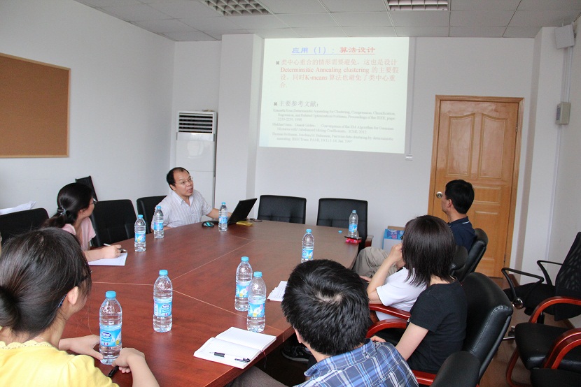 于教授的报告围绕划分型聚类算法的研究展开,介绍了划分型聚类算法是最常用的聚类算法,指出在划分型聚类算法中,每个类由类原型来代表,因此,每个类的类原型一般不能重合。于教授进一步认为在常用的划分型聚类算法中,重合类一般都存在,如模糊C均值算法,高斯混合型聚类算法等。总之,在本演讲中,于教授重点讨论了重合类的算法理论及其在聚类算法设计、分析和评估中的应用等问题。报告后,于教授与与会师生进行了热烈的讨论和多方面的交流。