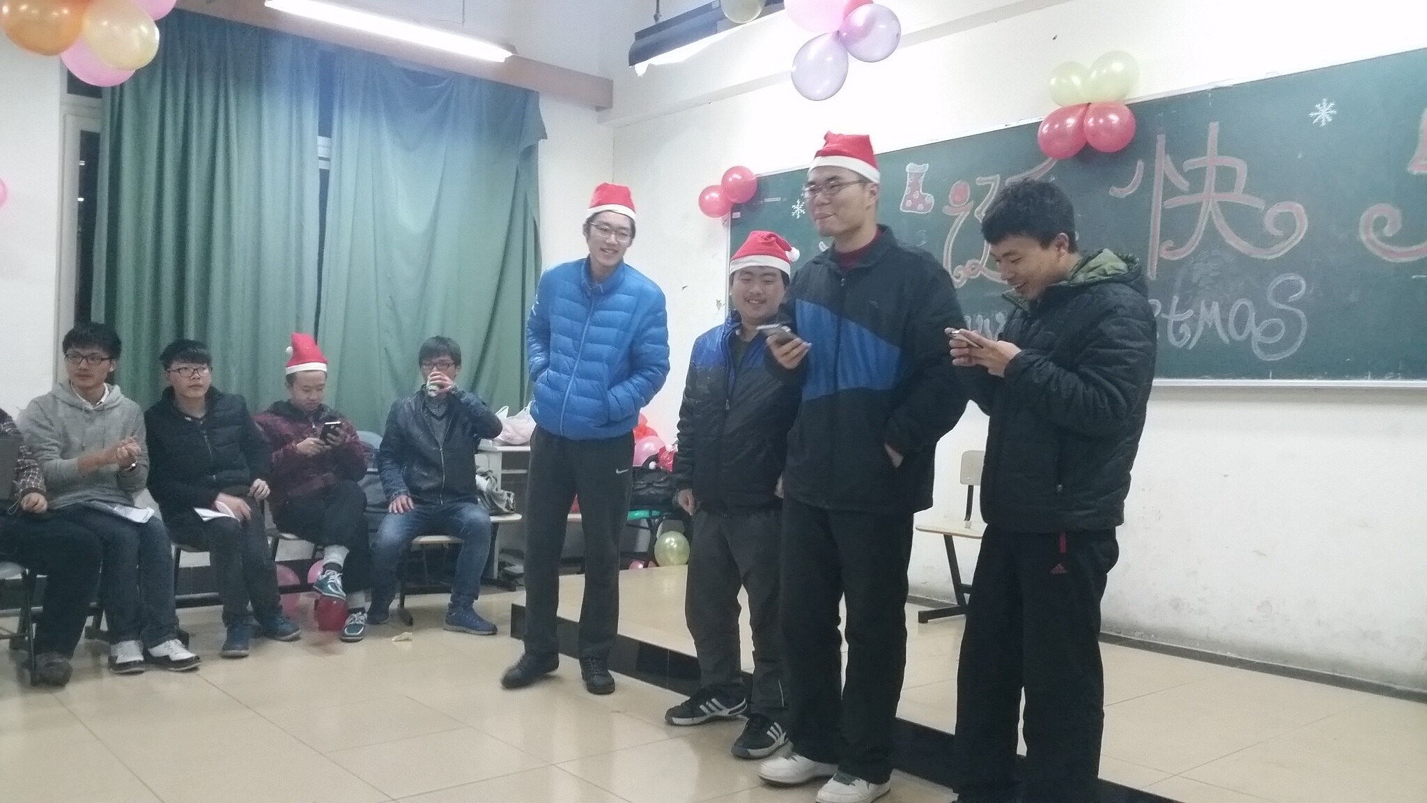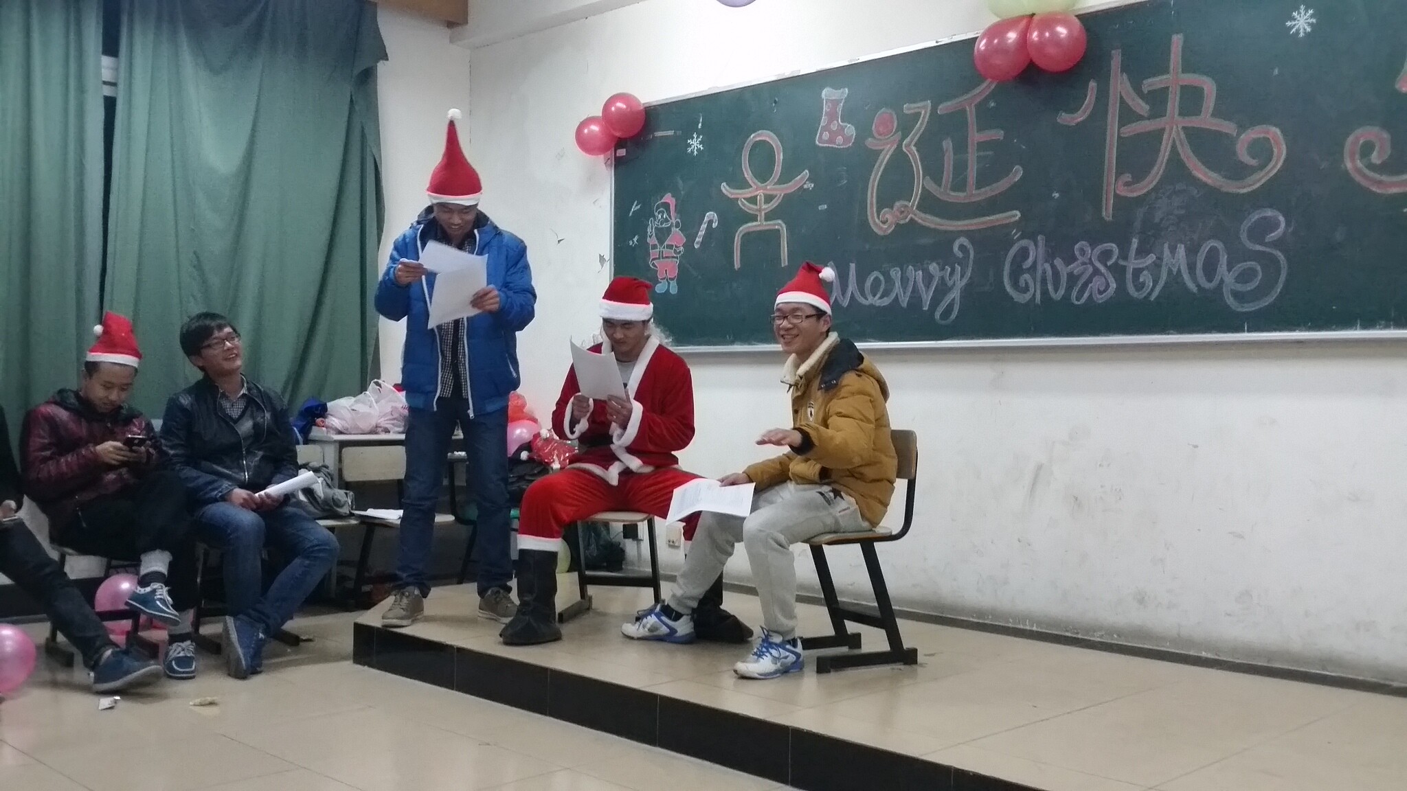 在圣诞节来临时,2014222班同学齐聚北1412举办了一场欢庆圣诞的晚会,校负责CPM的张辉老师和辅导员赵铮老师参加了活动。