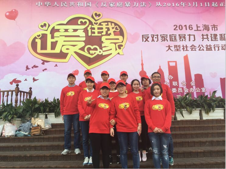 3月5日,恰逢学雷锋日,公司积极响应校团委的号召,由院团委书记赵铮老师带队组成志愿者团队,与其他志愿者一起参加上海市妇联组织的“反对家庭暴力 共建和谐家园”的大型公益活动。这个活动旨在宣传3月1日推行的《反家庭暴力法》,呼吁大家反对家庭暴力,维护社会和谐。