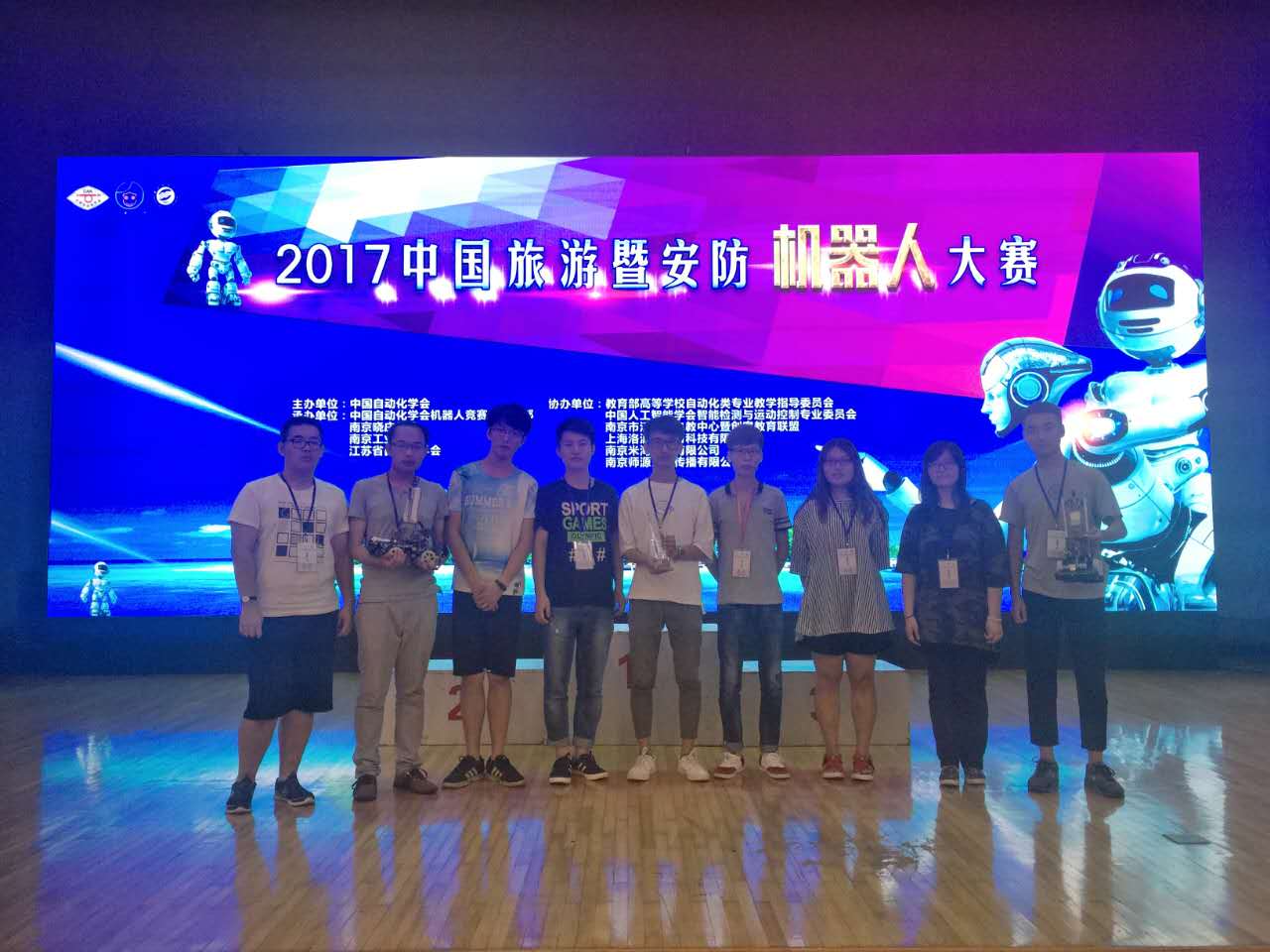 7月28日,为期两天的2017中国旅游暨安防机器人大赛在南京晓庄公司圆满落幕。本次比赛共吸引了全国50余所高校的259支团队共计1100余名选手参赛。公司Ep-Star机器人实验室在毕忠勤老师、刘大明老师的指导下,刘泽龙,陈涛,胡贵靖,王知涵,庞颖,陈相智,孙卉佶,许昌涛,张华宇共9名同学组成两支队伍在探险II机器人专项赛中积极备战,最终在该项目中取得了一等奖(亚军)和二等奖的好成绩。