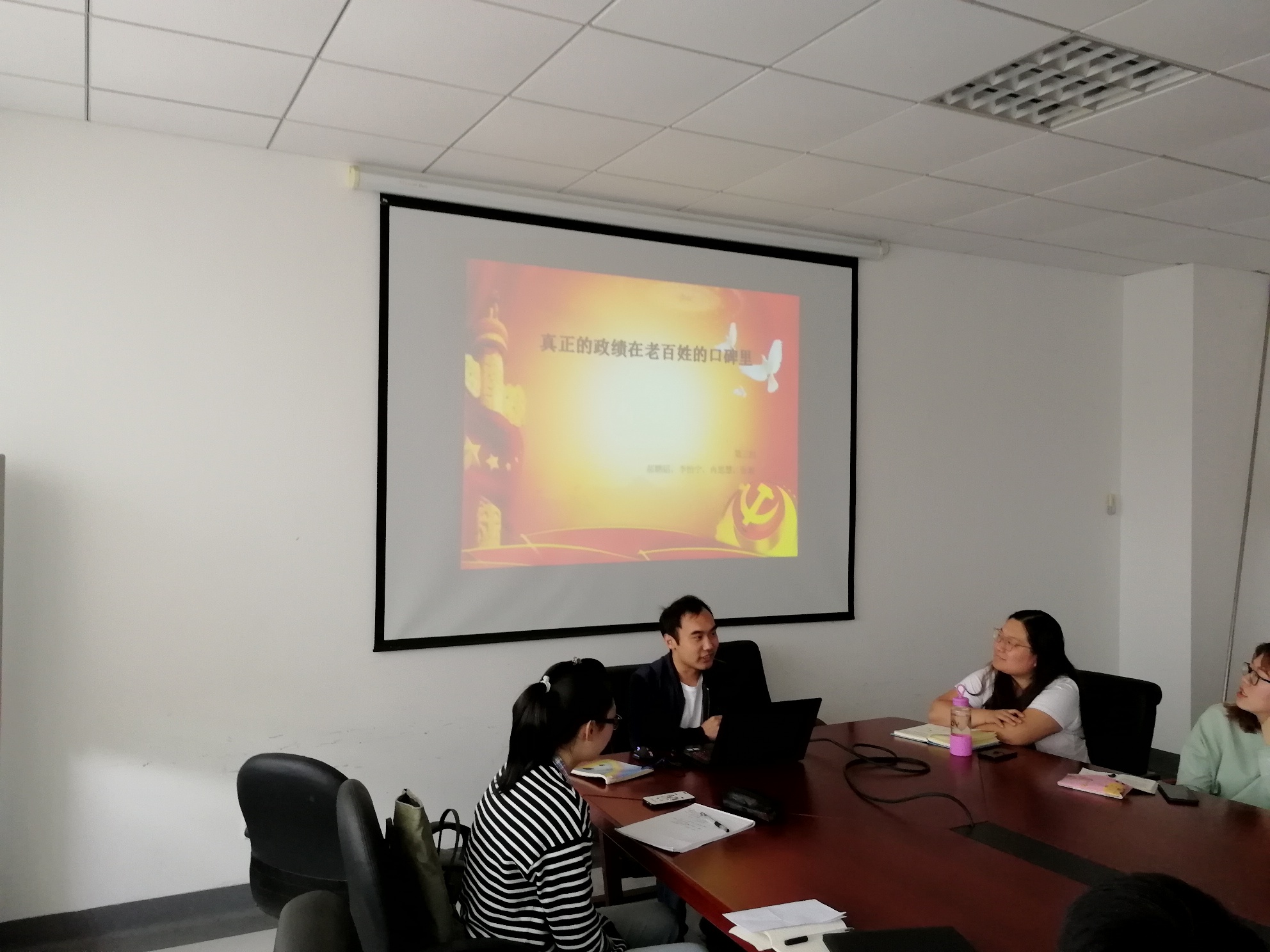 本次活动以小组展示的形式来进行交流学习,在此之前的几天里,由支部同学组成的三个小组分别就“习近平在上海”系列报到的三个分主题 “上海是党的诞生地,要牢记历史使命”、 “开明睿智才能进一步海纳百川”、 “真正的政绩在老百姓的口碑里”展开学习、实践活动,在本次活动上通过小组展示、讨论以加深对“习近平在上海”系列精神的理解与践行。在活动中,三个小组分别展示了各自小组对相应分主题的理解,并通过小组内每位同学经历的分享与探讨来加深对主题的理解。第三小组同学还将小组同学对“真正的政绩在老百姓的口碑里”的理解做成了动漫微电影,大家在欢笑中将本次会议带向高潮。之后,大家就三个主题展开了讨论与分享,各位党员积极发言,支部书记吴涵老师从过去、现在和将来三个层面分析了“习近平在上海”的三个系列报道,嘱咐党员们要不忘初心、心胸宽广、务实奋进,党员们最终在“负责任”、“乐奉献”等方面等达成一致。