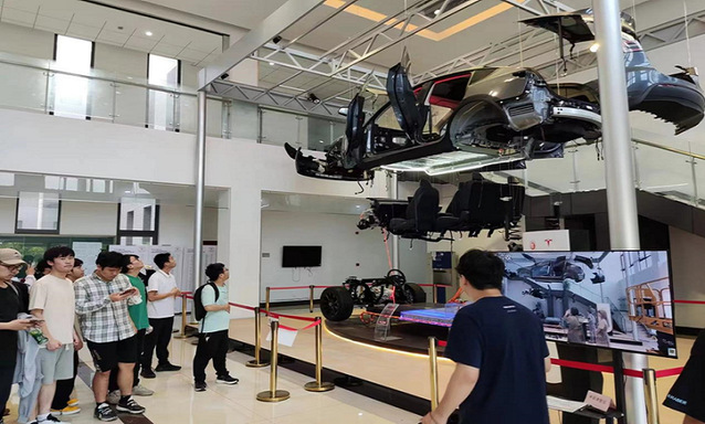 返校后,我们参观了位于公司工程中心的特斯拉3D解构示教平台。该平台是基于特斯拉的代表车型 Model Y 进行教具化改造、3D 解构后搭建的教学平台。通过 3D 解构的示教平台,我们不仅能够详细观察电动车的核心组成部分,还深入了解了其工作原理和技术应用。