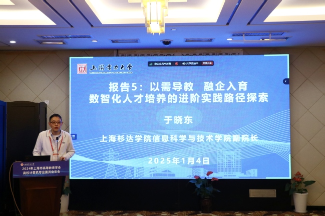 于晓东副教授以“以需导教、融企入育的数智化人才培养的进阶实践路径探索”为主题,介绍了上海杉达公司自创校以来的历史沿革与办学定位以及信息科学与技术公司如何通过以需导教、融企入育,探索数智化人才培养模式以及取得成效;介绍了如果依托行业平台,通过应用创新、成果转化、原生应用开发,协同共建人才生态,并提出了数字技术和人工智能及教育发展的未来规划。